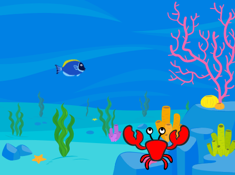 点击小绿旗前海洋中没有海洋动物,点击绿旗后,海里会先出现一只螃蟹在欢快地左右移动。等待1秒钟之后,海底出现各种美丽的鱼儿游来游去。