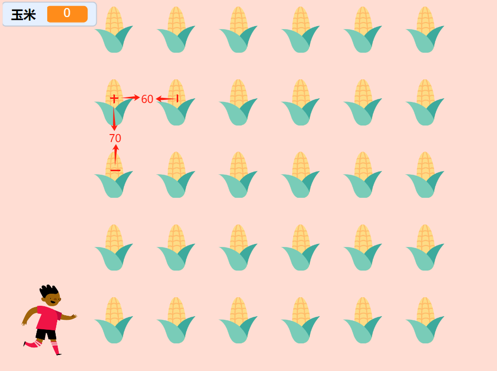 (3)对玉米编程:使用“将x坐标设为..”、“将y坐标增加..”来确定每排第一个玉米的位置,外面再加上“重复执行..次”来排出多排玉米,具体需要的玉米数量和间距参考图片,克隆体玉米碰到小男孩后,将变量“玉米”增加1;