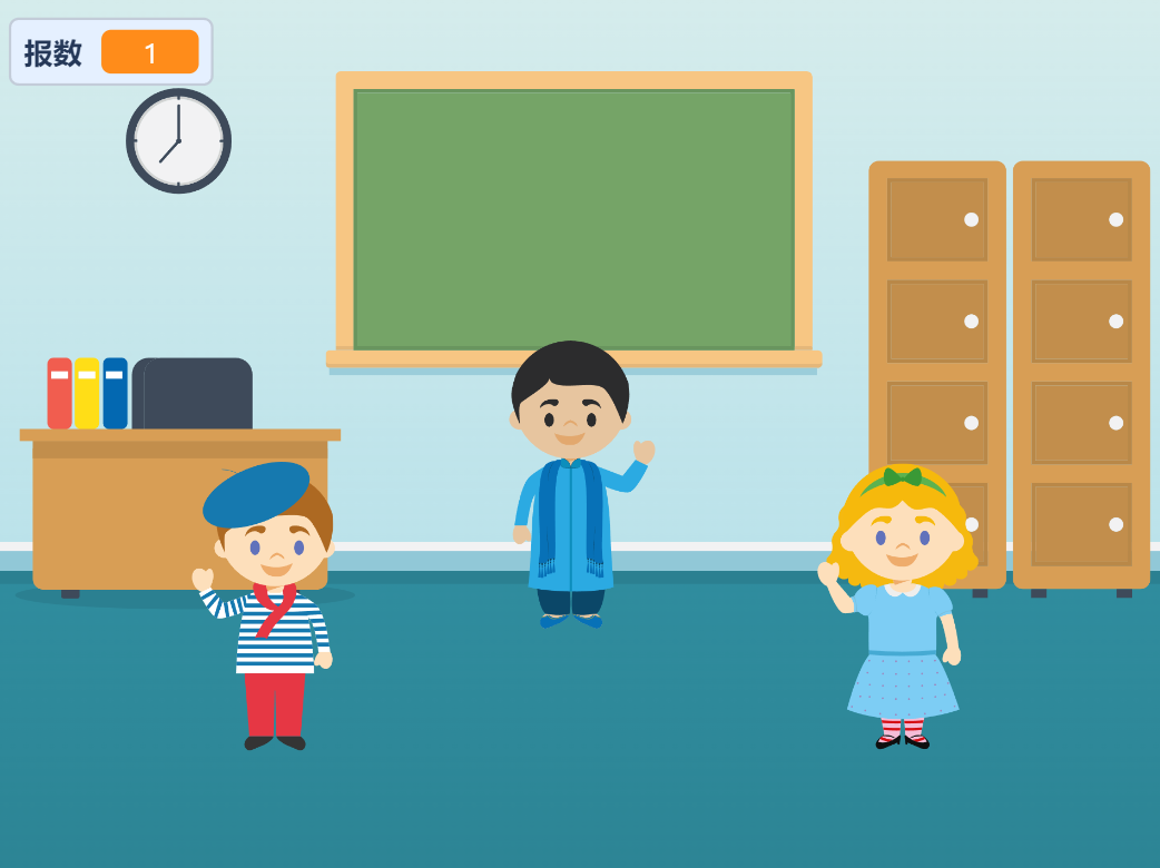 (2)报数从老师开始,当小绿旗被点击,将变量“报数”数值设置为1,老师说“1”,广播消息“男孩报数”并等待;
