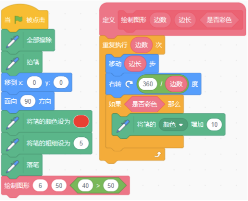 scratch运行下列程序,能绘制出如下右图所示的彩色六边形。