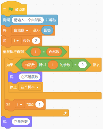 质数又称素数,是指在大于1的自然数中,除了1和它本身以外不再有其他因数的自然数。也就是如果除了1和它本身外,还存在另一个数能整除它,则它不是质数。scratch运行下列程序,若输入的内容为“7”,则角色会说“它是质数”。