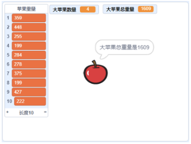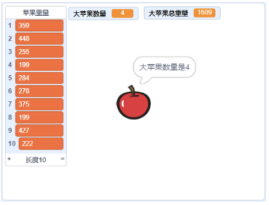 (1)点击绿旗,向列表中添加10个150到450之间的随机整数,作为10个苹果的重量;