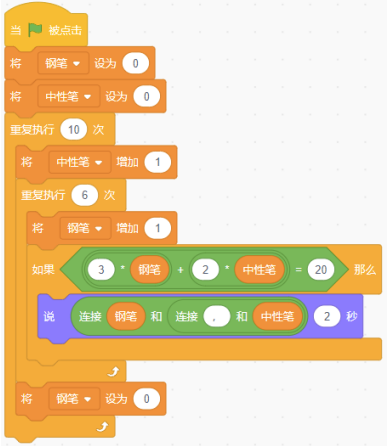 小明去买文具,钢笔一支3元,中性笔一支2元,小明一共花了20元,scratch运行下列程序,不能说出哪个选项?